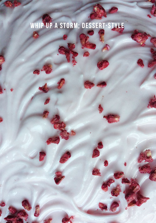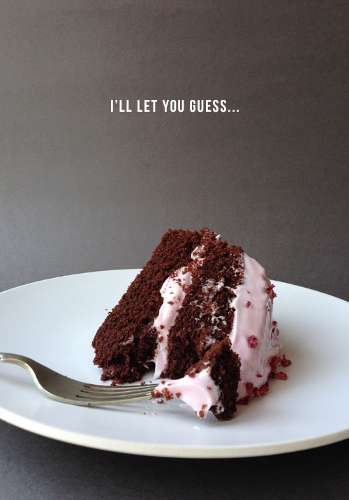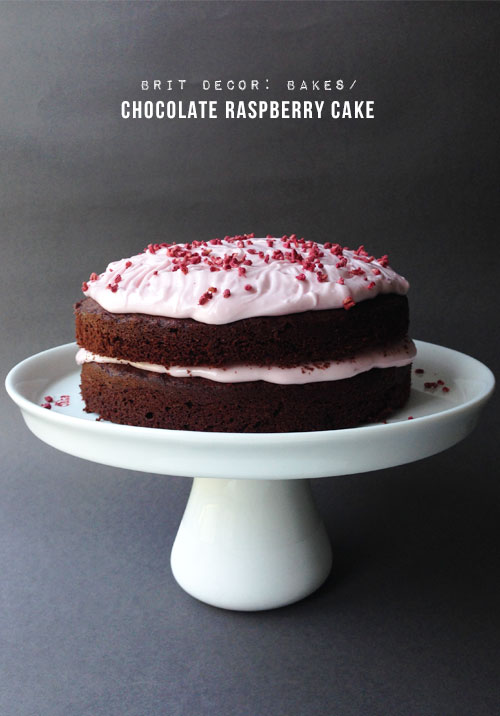For the frosting, place the cream cheese in a bowl then add the icing sugar along with 2-3 drops of pink food colouring, blend these together until smooth. Spread some of the frosting over the bottom layer of cake before placing the second layer on top, then repeat with the top layer. I chose to sprinkle some dried raspberry pieces over the frosting but you could try some dark chocolate pieces if you are feeling uber-indulgent!