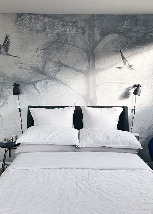 For some time I'd been toying with the idea of including a mural wall in our home, but I kept 'parking' the idea until I narrowed my choice of location down to our master bedroom. It was then that I stumbled across the Designer Wallpaper category over at Murals Wallpaper where I totally fell in love with the Grey Painted Tree Tops design - I knew that this dreamy illustration would perfectly suit a bedroom setting and compliment our Scandi-grey scheme, with more energetic pops of cobalt blue.