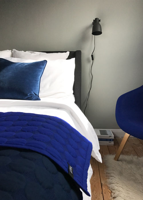 The overall scheme of this room is a mid-grey nod to Scandi styling (mid-to darker tones of grey can have a warming effect) with simple white detailing for a freshening feel. I chose crisp white cotton bedding to accentuate the contrast between the blue accents and greys, and opted for plenty of pillows for a luxurious feel. I also love the versatility of the Baby Dot quilt with it's double sided / two-tone palette of navy versus cobalt blue - here I've folded the quilt over for added depth of colour.