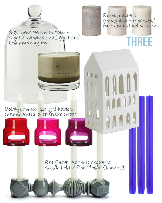 Candles work on so many different levels in a room scheme. They offer style, scent, colour and a huge range of choice - so really do make a great 'must have' accessory. If you are strapped for cash, you need only buy some inexpensive tealights and invest a little more in a jar or holder, alternatively, there is now a thriving luxury candle market for those of you feeling more indulgent. Whatever the budget, I find that candles really can add a luxurious feel to a room.