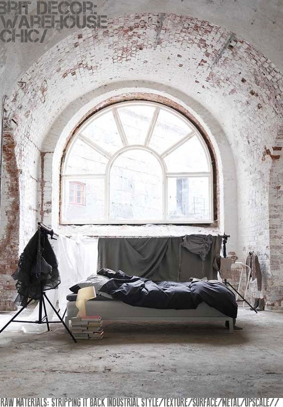 I love this industrial chic look! The scheme is simple and uncomplicated but at the same time bursting with light from the elegant arched window which is surrounded by a multitude of different textures.
