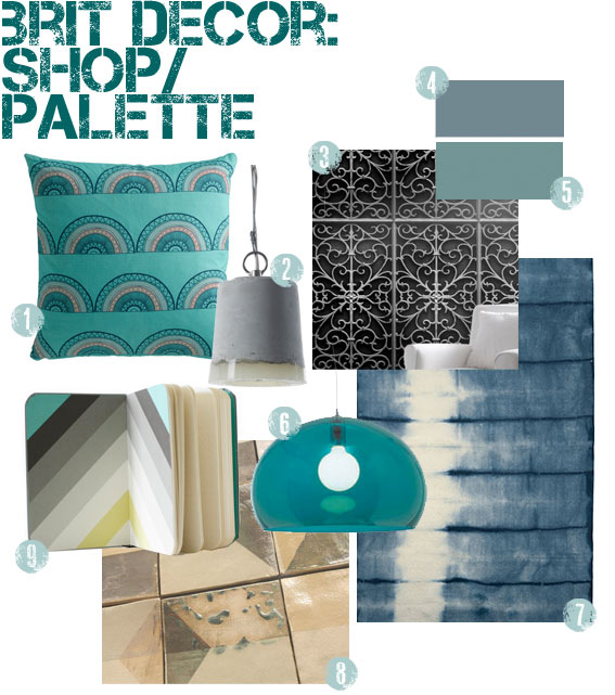 | 1 Horseshoe Arch in Teal cushion £45 Clippings 2 Concrete 'big' pendant £140 Clippings 3 Black wrought iron wallpaper £70 Rockett St George 4 Pewter paint £32 2.5L 5 Oval Room Blue £32 Farrow & Ball, both from Designer Paint 6 Kartell FI/Y Colour pendant light by Ferruccio Laviani £159 Heals 7 Savine Indigo Rug £850 Designers Guild 8 After Lowry tiles £8 each, Clippings 9 Wino Tatu notebook £10.27 Clippings |