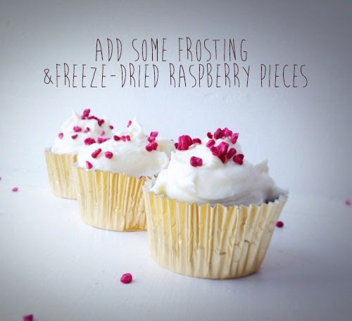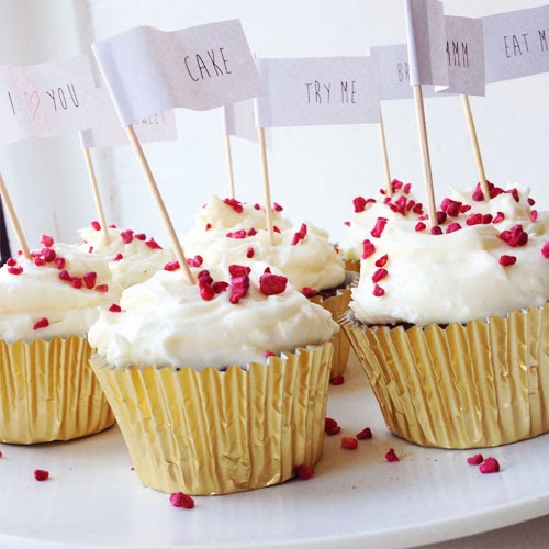 Gently sift the icing sugar and add the butter before mixing together and adding the cream cheese - beat until light and fluffy. I chose to sprinkle some freeze-dried raspberry pieces over the frosting and couldn't resist adding some cute little flags.