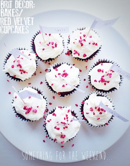 Something for the weekend…I have wanted to make some red velvet cupcakes for too long to remember, so in a eureka moment I decided to roll up my sleeves and have a good old fashioned baking session this week. The deep rich red colouring of the fluffy sponge set against the pale cream frosting makes these little gems look so tempting and so it seemed only right to add some glamorous gold cupcake cases to complete the luxurious look! As with many of the Brit Decor bakes, I tend to opt for simple and speedy recipes and this one is no exception...