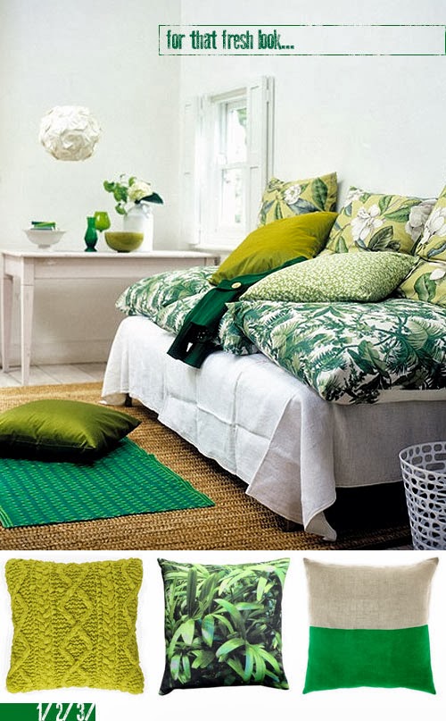 1/ Kelby Green Cable Knit Cushion £40 Habitat 2/ Zingy Palm Print Linen Cushion £75 Culture Label 3/ Dipped Cushion in Emerald $49.95 Aura Home
