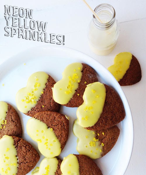A very big and very happy 'hello' to you my friends in this, my first post of 2014! What better way to kick off the year than sharing a Brit Decor bake with you? This one is a typically sweet treat and bang on trend for 2014 with Spring-bright yellow lemon flavoured icing and neon sprinkles. Naturally I couldn't resist using my heart-shaped cookie cutters to show my big love to you all!
