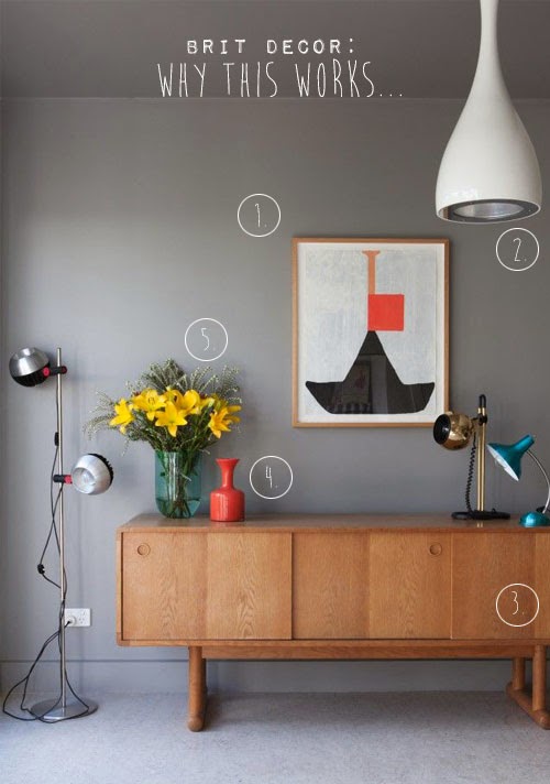 Introduce oak or beech woods to your greys, like this stunning mid-twentieth century sideboard (no.3) and the simple frame (no.1). This will add instant warmth and texture and bring your scheme alive. Without the correct lighting, your greys will descend into shades of charcoal (which is fine if that's the look you are going for), if not, employ some bold lighting to lift the room. For this, white glossy pendants can look fab when set against a chalky grey, like no.2 above.