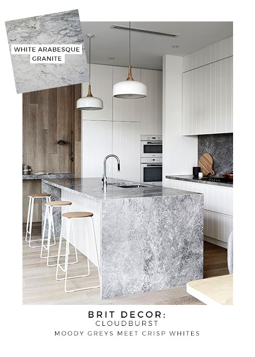 I love the scheme 'above' which I put together under the theme of Cloudburst due to the moody greys and how these seamlessly fuse with crisp whites - like a collection of clouds. There's a touch of Scandinavian influence in here too with the pale wood tones. My inspiration was driven by Modern Worktop's White Arabesque Granite.