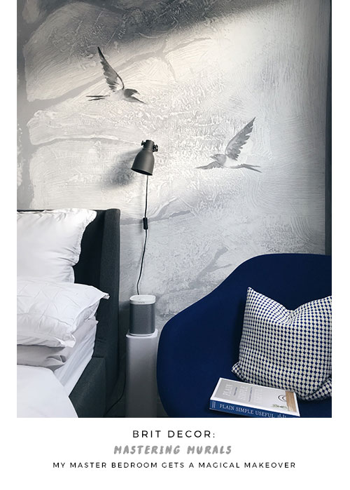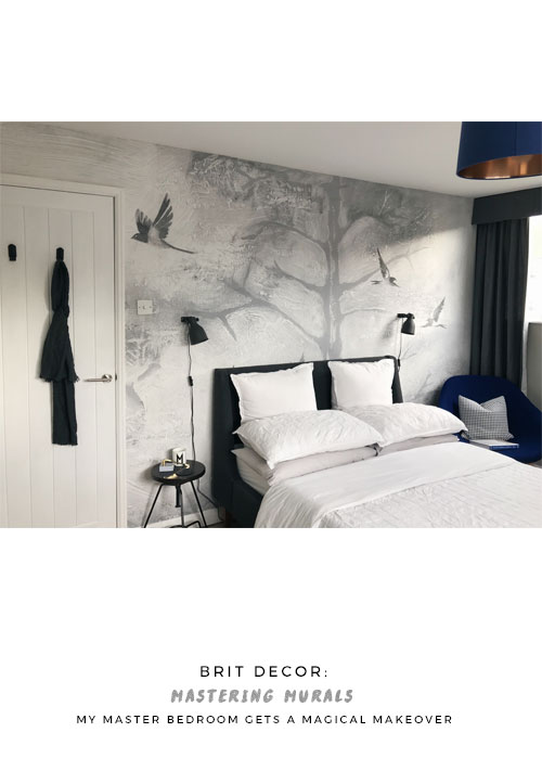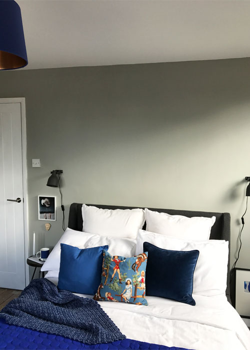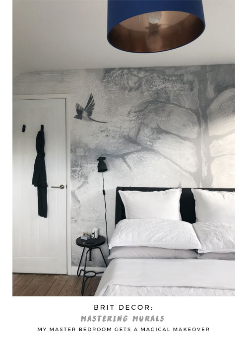 For some time I'd been toying with the idea of including a mural wall in our home, but I kept 'parking' the idea until I narrowed my choice of location down to our master bedroom. It was then that I stumbled across the Designer Wallpaper category over at Murals Wallpaper where I totally fell in love with the Grey Painted Tree Tops design - I knew that this dreamy illustration would perfectly suit a bedroom setting and compliment our Scandi-grey scheme, with more energetic pops of cobalt blue.