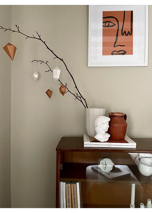 Surrounded by countryside it didn't take long for my forage to bear fruit, or a branch at least, which I suspended from the ceiling using some nordic inspired decorative twine. I then began the easy construction of some 3D paper gems in copper, silver and pearl finishes - I love how these appear to serenely float in mid-air.